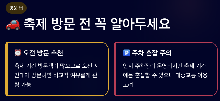 A. 축제 기간에는 임시 주차장이 운영되지만 혼잡할 수 있습니다.