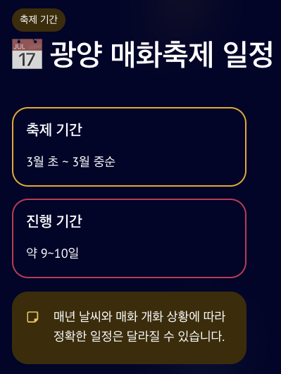 매년 날씨와 매화 개화 상황에 따라 정확한 일정은 조금 달라질 수 있습니다.