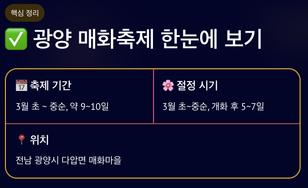 광양 매화축제기간은 보통 3월 초부터 약 9~10일 동안 진행되며 매화 절정 시기는 3월 초에서 중순 사이입니다. 섬진강을 따라 펼쳐진 매화 풍경과 다양한 체험 프로그램을 함께 즐길 수 있는 봄 대표 축제입니다.