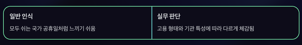 | 일반 인식 | 모두 쉬는 국가 공휴일처럼 느끼기 쉬움 |