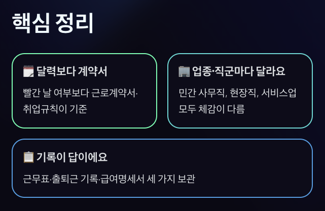 핵심은 내 회사가 어떤 기준으로 운영되는지 보는 거예요. 친구가 쉰다고 해서 나도 쉬는 건 아니고, 반대로 내 회사가 쉰다고 해서 모든 기관이 다 멈추는 것도 아니에요. 이 차이를 이해하면 헷갈림이 훨씬 줄어들어요.