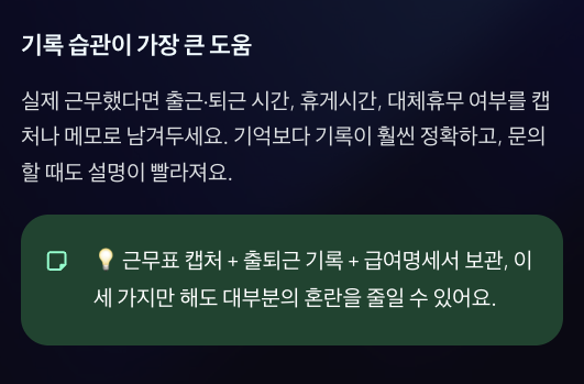 복잡한 규정을 모두 외우는 것보다 내 상황을 설명할 수 있는 자료를 남기는 게 훨씬 실용적이에요. 직장생활에서는 이런 작은 기록 습관 하나가 생각보다 큰 차이를 만들어요.