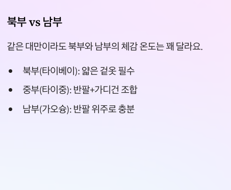 중부와 남부로 내려갈수록 대만 4월 날씨는 조금 더 안정적이고 따뜻한 편으로 느껴져요. 타이중은 비교적 쾌적하다는 평가가 많고, 가오슝은 낮 기온이 더 올라가서 거의 초여름처럼 느껴질 때도 있어요. 같은 대만 여행이라도 북부 중심 일정과 남부 중심 일정의 옷차림은 조금 달라질 수 있어요. 북부는 얇은 겉옷이 필요하고, 남부는 반팔 비중을 더 높여도 무난한 편이에요.