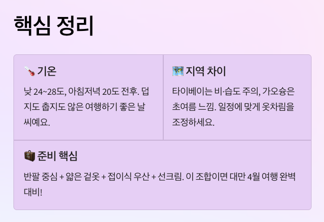 대만 4월 날씨를 한 단어로 정리하면 ‘가벼운 초여름’에 가까워요. 그래서 완전한 여름휴가 짐처럼 무겁게 싸기보다는, 가볍고 빨리 마르는 옷 중심으로 챙기는 게 좋아요. 선크림, 우산, 얇은 겉옷, 편한 신발 이 네 가지만 잘 챙겨도 체감 만족도가 확 올라가요. 날씨 자체는 무난한 편이라 준비만 잘하면 여행 난도가 크게 높지 않아요.
