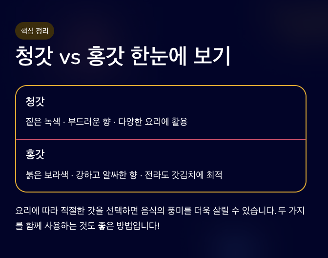 청갓과 홍갓은 같은 갓 종류이지만 색깔과 맛, 향에서 차이가 있습니다. 청갓은 부드러운 향과 맛이 특징이고 홍갓은 향이 강하고 알싸한 맛이 진합니다. 요리에 따라 적절한 갓을 선택하면 음식의 풍미를 더욱 살릴 수 있습니다.